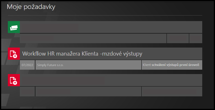 Aktuální stav workflow ve složkách je vždy zobrazen jako ikona : workflow není spuštěno (černá), workflow probíhá/čeká na akci (modré), workflow skončilo (zelená).