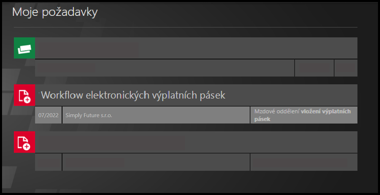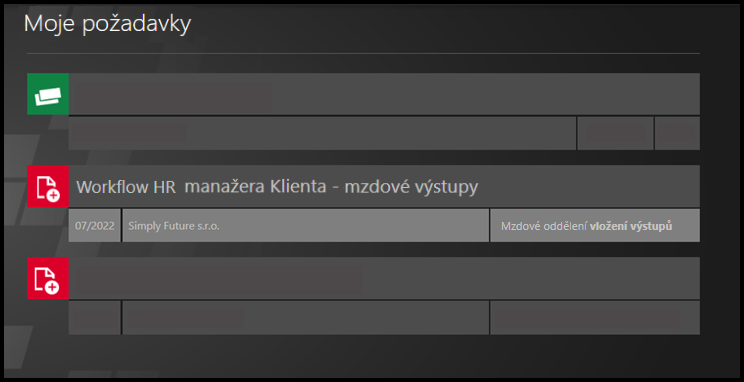 Aktuální stav workflow ve složkách je vždy zobrazen jako ikona : workflow není spuštěno (černá), workflow probíhá/čeká na akci (modré), workflow skončilo (zelená).
