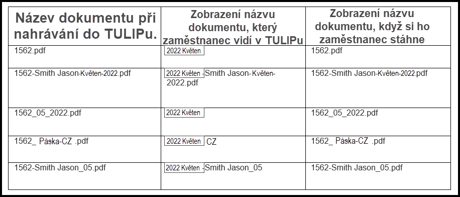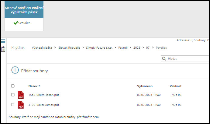 Nahrané soubory musí být v určeném formátu a musí obsahovat osobní číslo zaměstnance na začátku. Tímto způsobem je soubor automaticky poslán pouze správnému zaměstnanci.