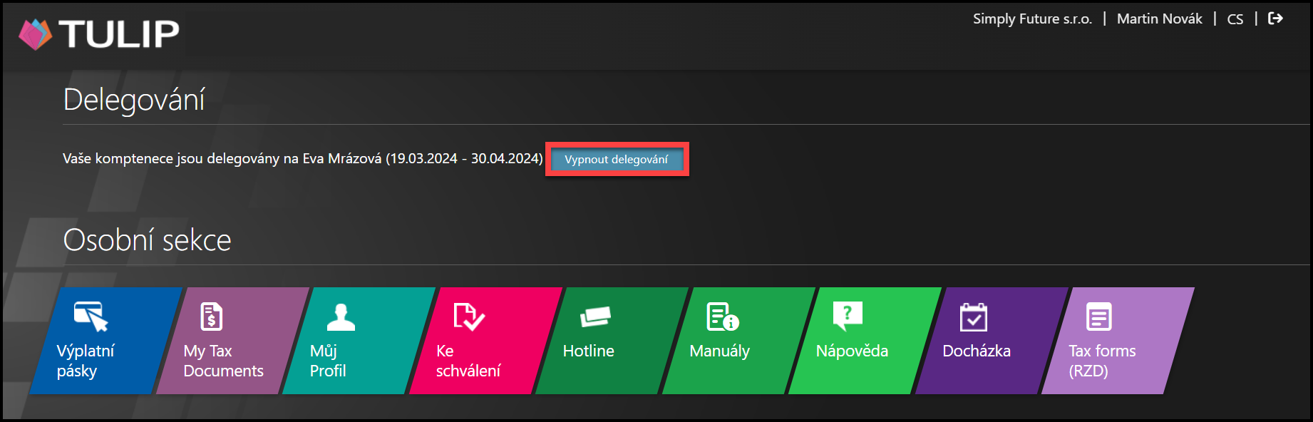 Upozorňujeme, že nastavení TULIP-u, které vidíte, vždy závisí na individuálních požadavcích a nastaveních přístupu do TULIP-u pro vaši společnost. Ne všechny společnosti využívají funkci Delegace.