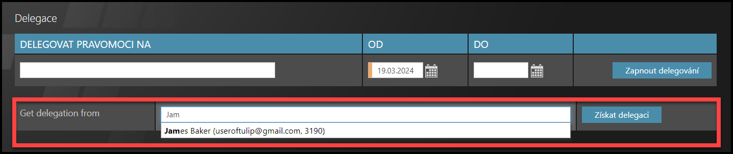 Začněte psát jméno uživatele, od kterého převezmete delegaci. Zobrazí se jméno, e-mailová adresa a osobní číslo, abyste si ověřili, že je to osoba, kterou hledáte. Klikněte na její jméno.