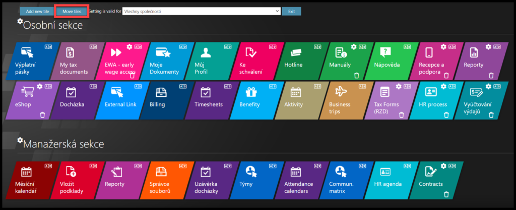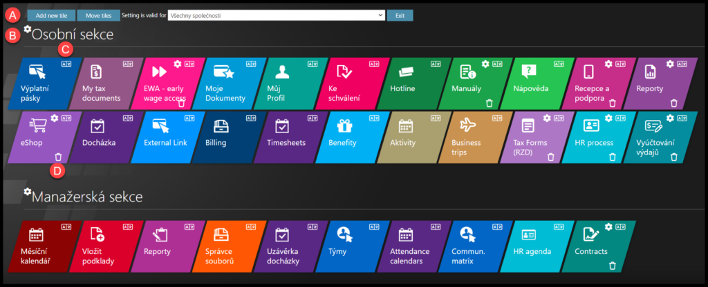 - Administrátor může měnit názvy a umístění všech dlaždic pro každého ve společnosti.
