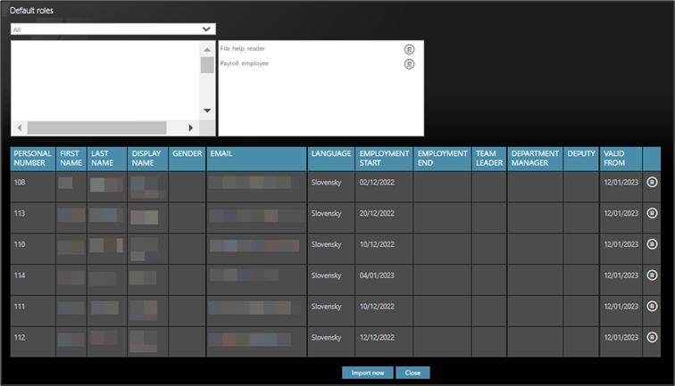 Můžete také vidět předvolené role, které budou automaticky přidány všem importovaným zaměstnancům.