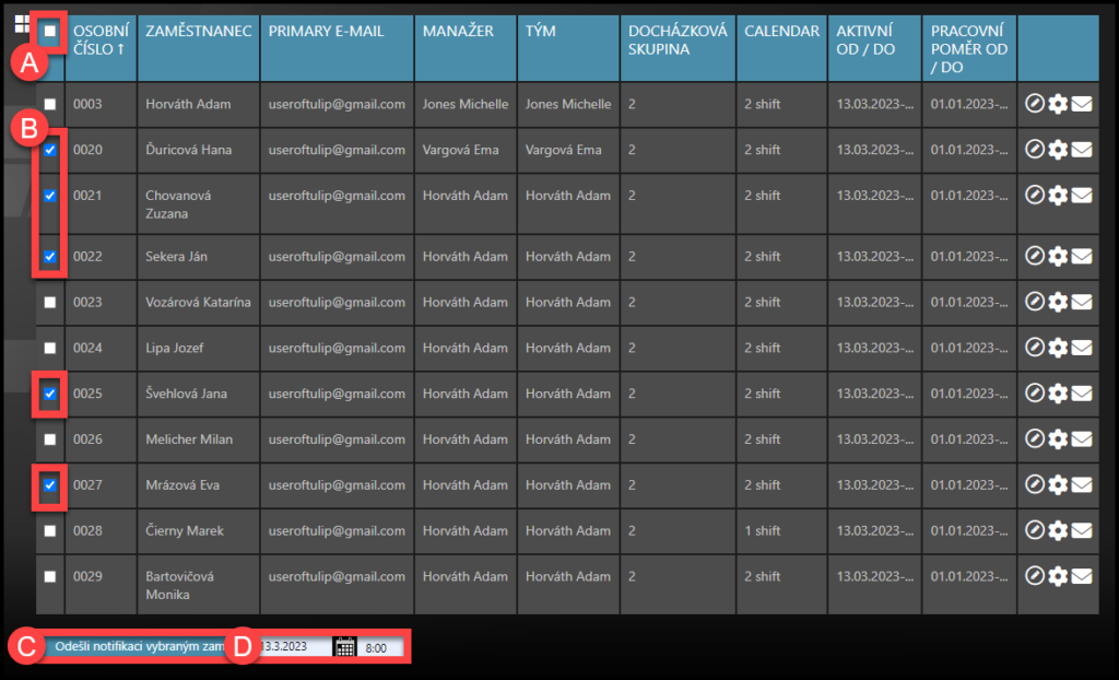 A) Klikněnte a vyberte všechny vyfiltrované zaměstnance