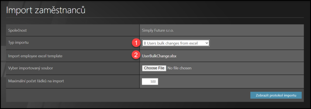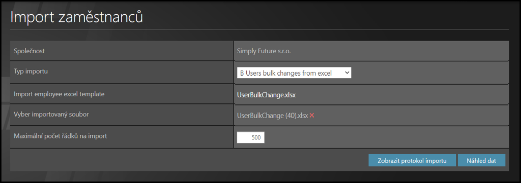 - Vyberte typ importu – import změn (Users bulk changes from excel) – změňte manažery, nastavení docházky nebo ukončete zaměstnance hromadně.