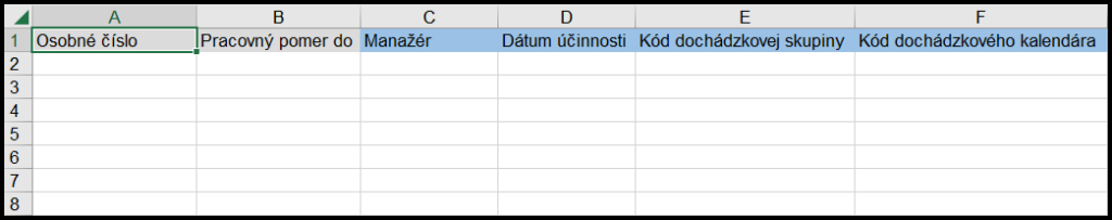 Vyplňte šablonu Excelu: vždy je nutné vyplnit tučně označená pole. Pokud však používáte také evidenci docházky, musíte vyplnit i další pole týkající se nastavení docházky –