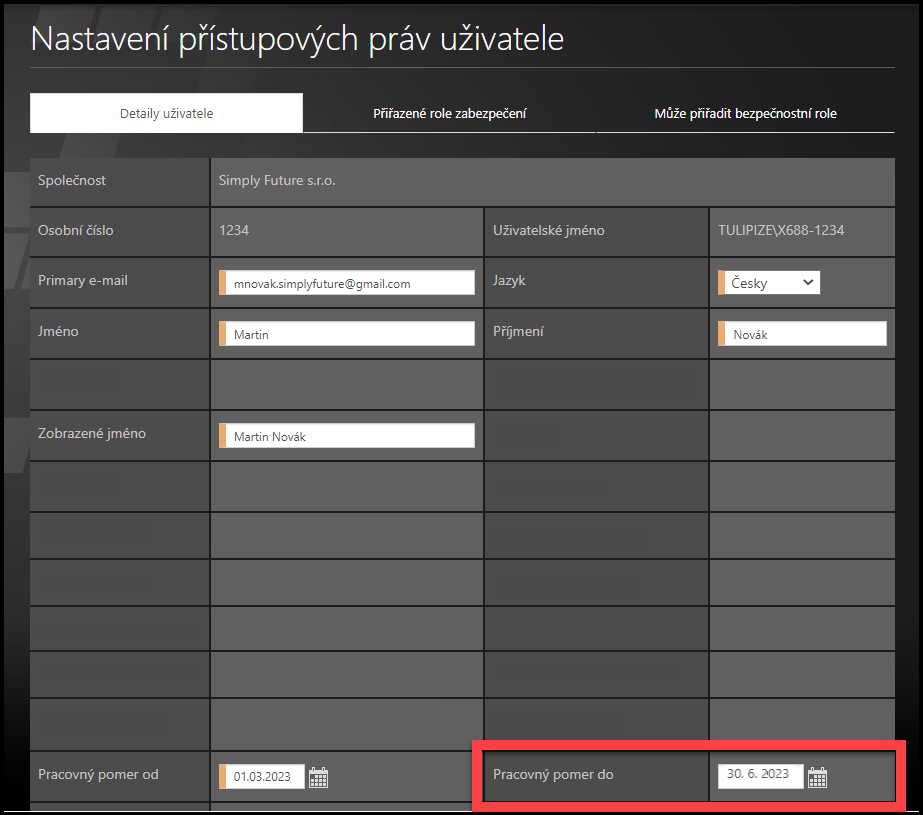 V části Pracovní poměr do klikněte na ikonu kalendáře nebo zadejte datum ukončení pracovního poměru. Tímto datem bude ukončen přístup k funkcím TULIP-u.
