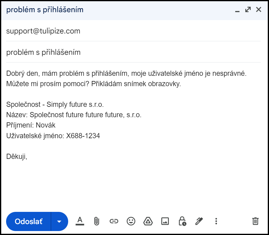 Pošlete zprávu na support@tulipize.com pomocí Vašeho přihlašovacího e-mailu v TULIPu.