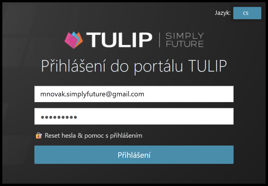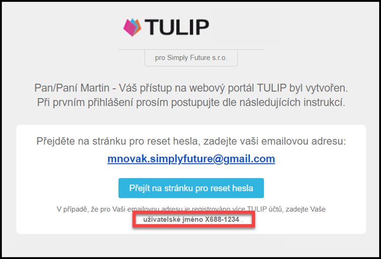 Místo e-mailové adresy použijte své uživatelské jméno. Najdete ho také v prvním e-mailu od TULIP-u.