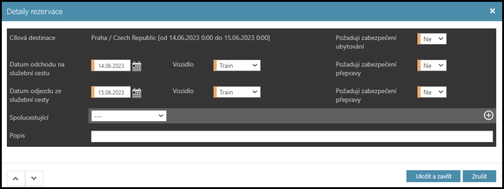 Upřesněte, zda požadujete zajištění ubytování nebo dopravy. V případě, že označíte možnost Ano, recepce/asistent dostane tuto informaci a může vám ubytování či dopravu rezervovat.