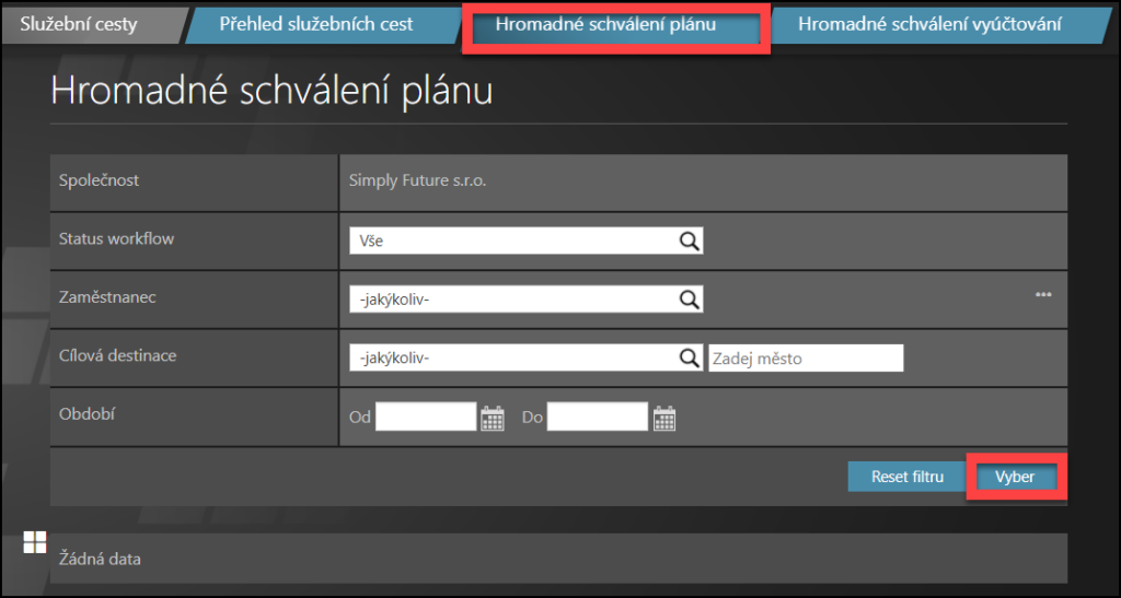 V případě potřeby použijte filtry: Status, Zaměstnanec, Cílová destinace, Období od/do.