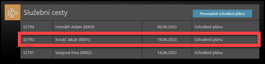 Kontrola jakéhokoli plánu: kliknutím na řádek jednotlivého plánu pracovní cesty zobrazíte detail cesty.