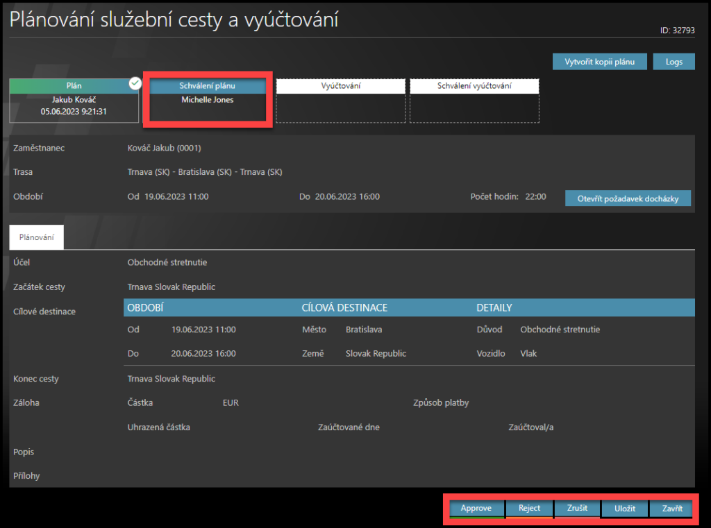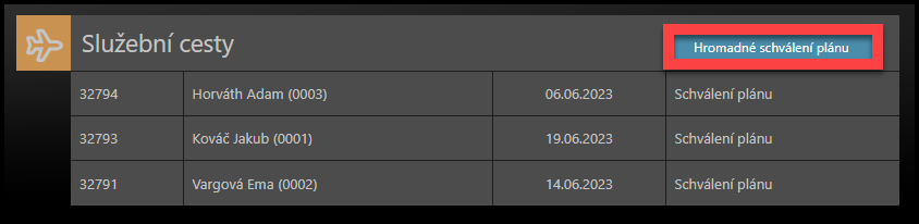 Zaměstnanec vytvoří plán služební cesty. Jako nadřízený můžete schválit nebo zamítnout plán služební cesty zaměstnance a to buď individuálně nebo více najednou hromadným schvalováním. Po schválení počkejte, až se zaměstnanec vrátí z cesty a vyplní vyúčtování služební cesty. Následně schvalte (nebo zamítněte) i vyúčtování služební cesty.