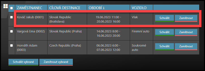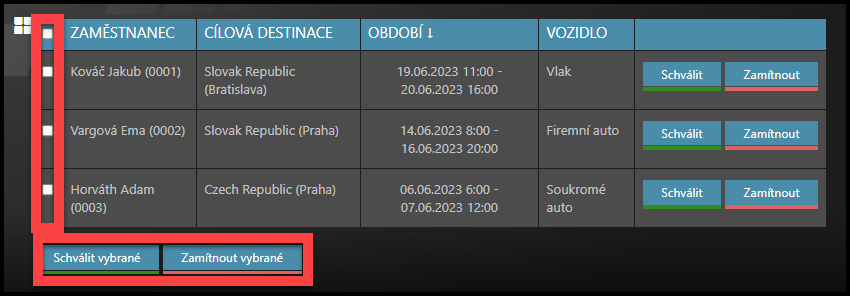 Přejděte na konec stránky a kliknutím na tlačítko Schválit vybrané nebo Odmítnout vybrané schválíte/zamítnete všechny vybrané žádosti.