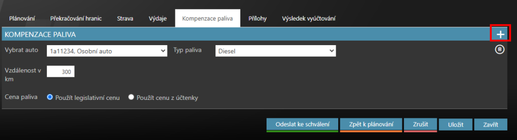 Klikněte na další záložku nazvanou Kompenzace paliva, pokud jste použili soukromé vozidlo pro služební účely.