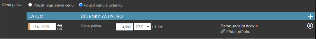 - Cena paliva – použijte statistickou cenu nebo klikněte na políčko použít cenu z účtenky.