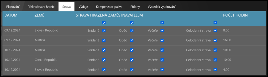 - data – pokud jste navštívili více destinací během jednoho dne, měli byste vidět dva (nebo více) řádků se stejným datem, ale různými místy. Zaškrtněte políčka, ve kterých vám společnost vyplácela stravné.