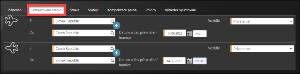 - Datum a čas překročení hranice – zadejte čas překročení hranice vozidlem nebo čas přistání letadla v destinaci