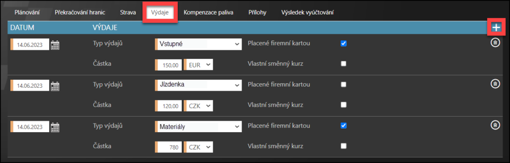 - Typy výdajů – například ubytování, lístky, pojištění atd.