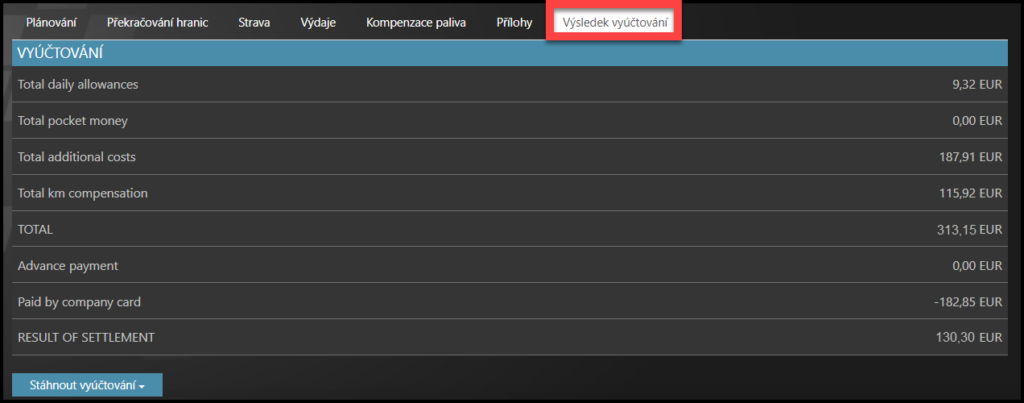 Zde můžete okamžitě zkontrolovat výsledek vyúčtování a stáhnout souhrn ve formátu XLS (soubor MS Excel).