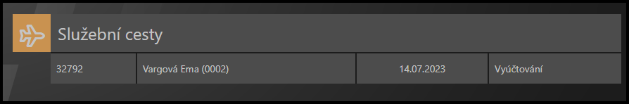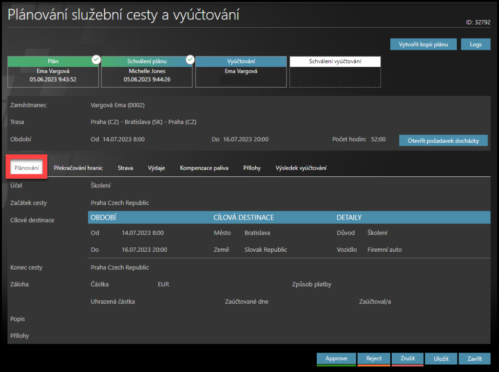 - Plán – podrobnosti o plánu služební cesty a výpočet platby vopřed