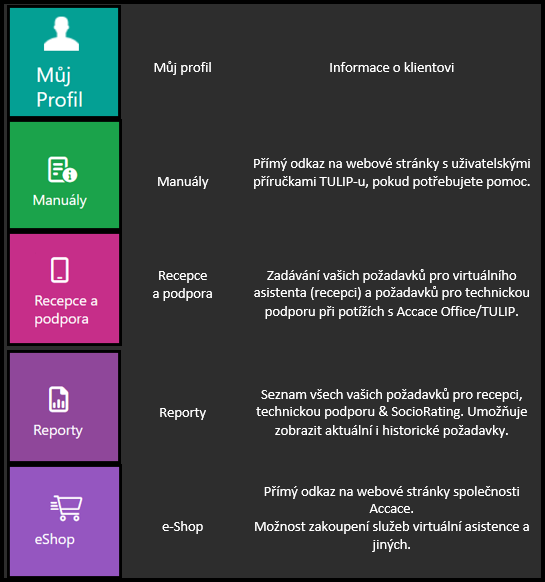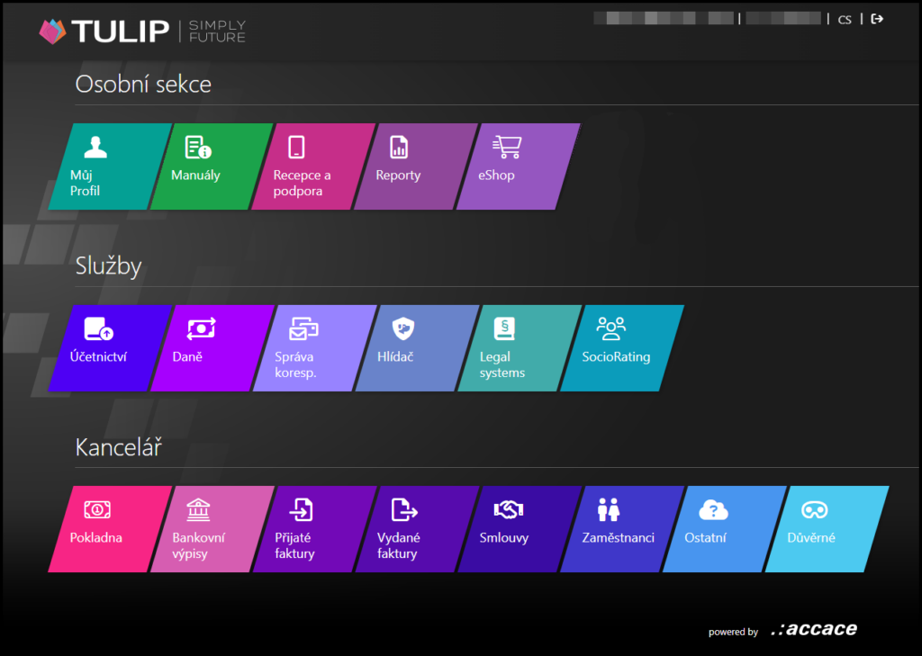 Upozorňujeme, že zobrazení TULIPu, které vidíte, vždy závisí na vlastních požadavcích a nastaveních přístupu do TULIPu pro vás a vaši společnost. Ne všichni uživatelé využívají Accace Office.