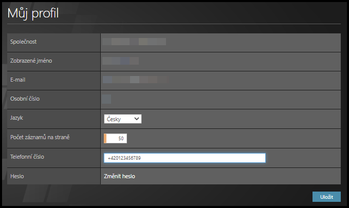 Obsahuje osobní informace o klientovi-uživateli (jméno, e-mail, jedinečné osobní číslo TULIP účtu). Umožňuje změnit heslo. Doporučujeme zde doplnit telefonní číslo pro efektivnější komunikaci ohledně požadovaných služeb či případných technických problémů.