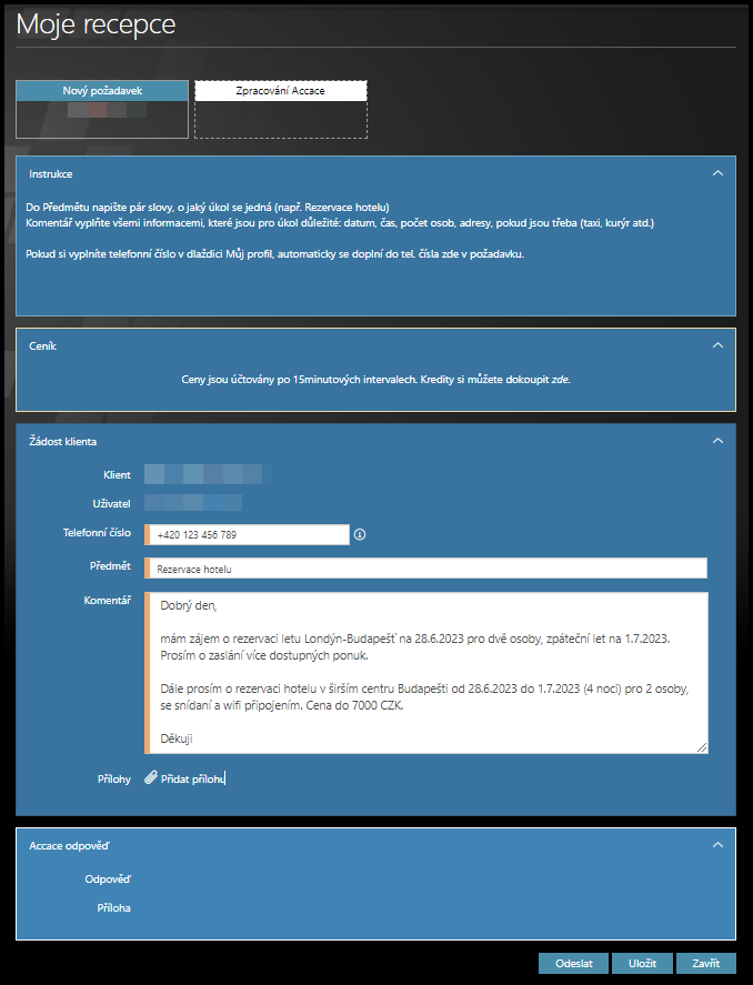 1. Odeslat – Požadavek ihned odešle na recepci.