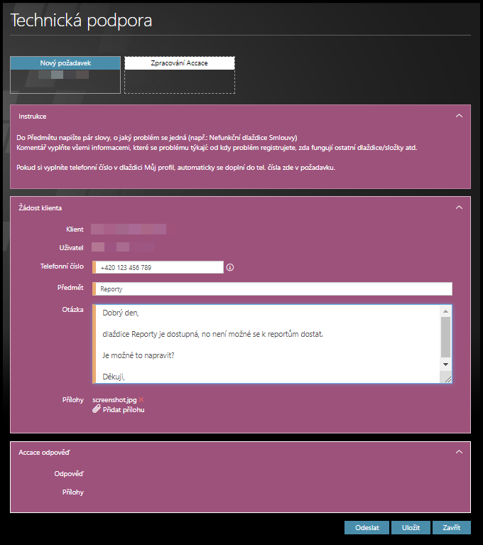 1. Odeslat – Požadavek ihned odešle na oddělení podpory.