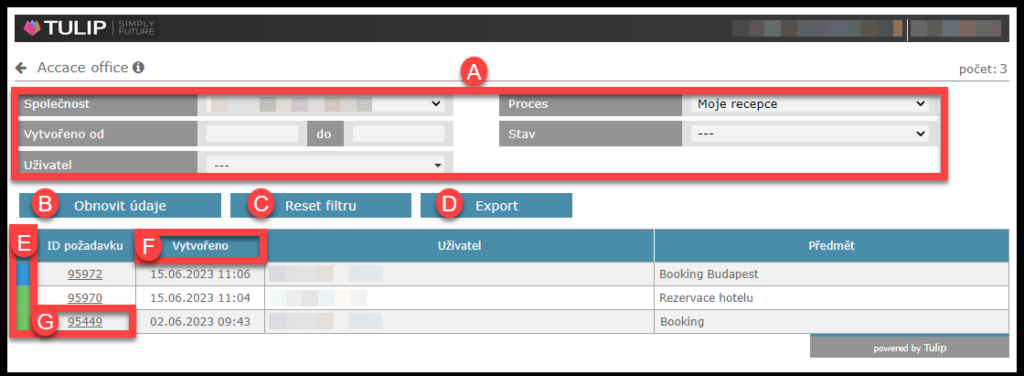 A) Filtrovat – vyberte filtr (společnost, datum, uživatel, typ požadavku, stav)