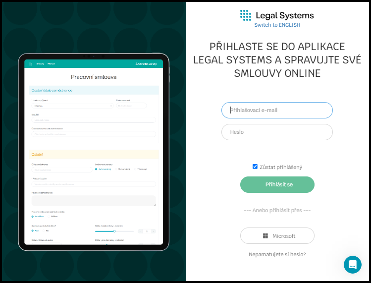 Přímý odkaz na webové stránky přihlášení do Legal systems – služeb pro digitalizaci práva.
