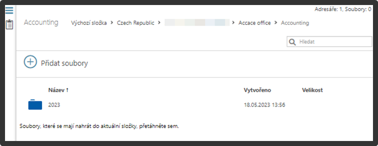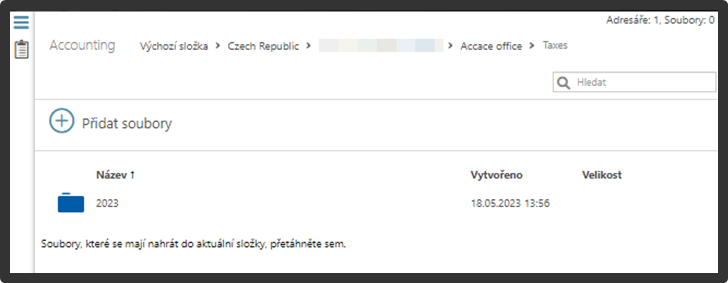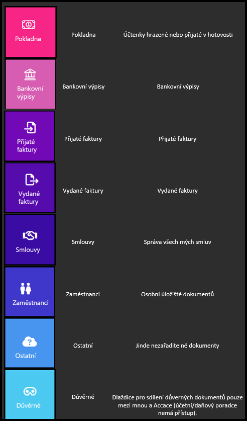 Sekce Kancelář slouží jako digitální „šanony“ pro roztřídění, sdílení a archivaci různých typů  dokumentů podle typu a data. Umožňuje sdílení dokumentů mezi účetním/daňovým poradcem a klientem. Speciální dlaždice „Důvěrné“ není pro účetních/daňové poradce k dispozici – je viditelná a přístupná pouze pro klienta a Accace. Na nově uložené dokumenty jste upozorněni e-mailovou notifikací.