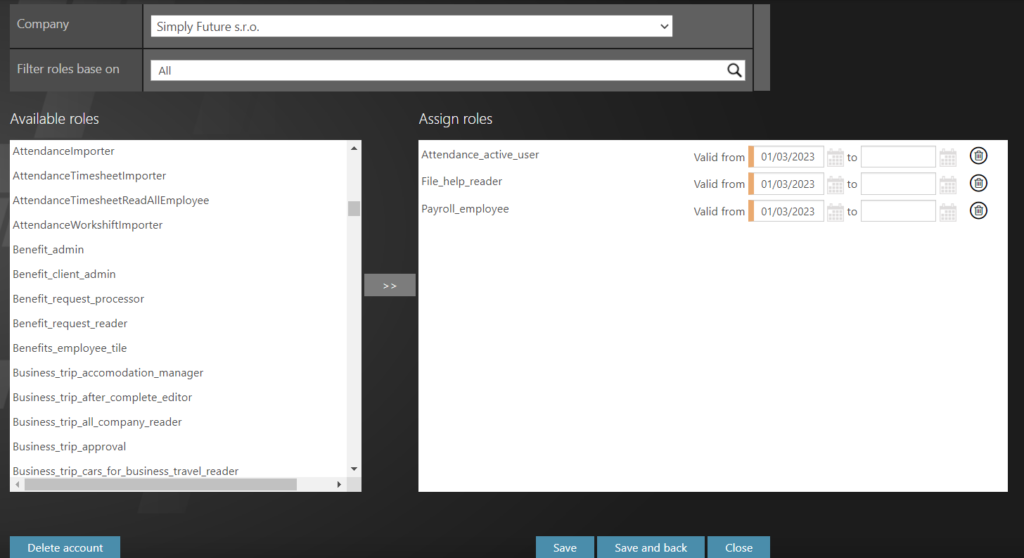 3. First select roles – click with the left mouse button on a role, it will move to the right list, which will be added (or removed) to employees.