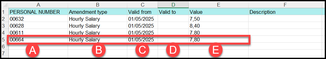 D) Valid to – Use this if you want to set up a specific date of validity or delete/deactivate the current amendment. To delete an amendment, keep the “Personal number”, “Amendment type”, “Valid from” date and “Value” cells the same, only change the “Valid to” date.
