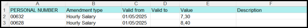 A) Personal number – If you insert a personal number that does not exist, it will not be imported. If you insert an already existing personal number, the system will add the amendment to the exact employee. It is not possible to edit personal numbers with this import table.