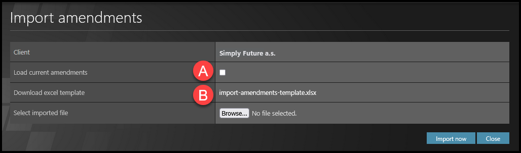 Change amendments: Tick “Load current amendments” checkbox & then click “import-amedments-template.xlsx”.
