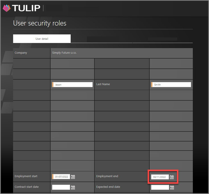 Click on the calendar icon or enter the Employment end date. The access to TULIP functions will be terminated to the employment end date.