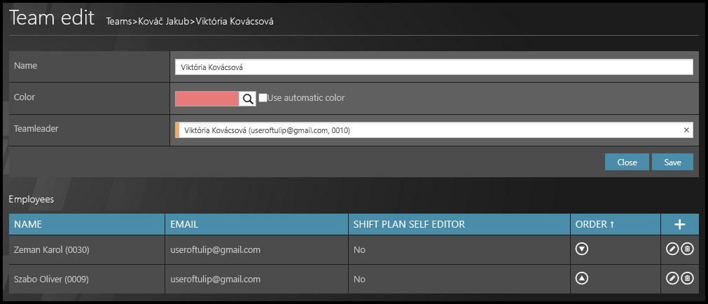 - Color – This color will be displayed in the Shift plan. If you tick the checkbox “use automatic color“, the color is by default dark blue and it will be the same for all teams with this checkbox ticked.