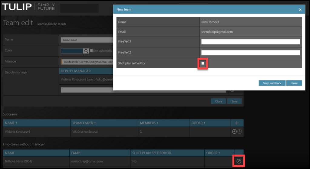 If you want a certain employee to edit his/her own shifts, click on the pencil icon and then tick the checkbox in the new window.