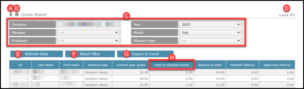 C – Filters – Some filters work separately and others can be combined. You can search inside most filters (company, employee etc.), type the first one/two/three letters on your keyboard. To apply a filter, you must click on a (E) “Refresh Data” button. The report can usually be filtered based on those parameters: