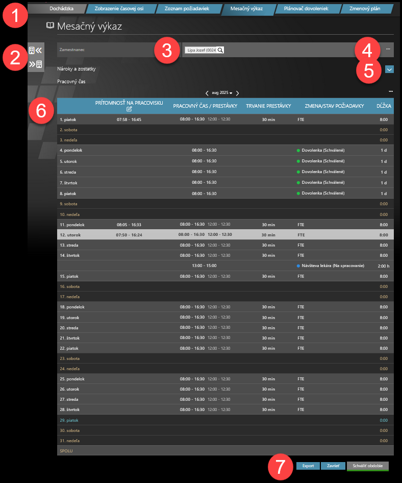 Výkaz s presnými časmi prítomnosti a neprítomnosti v práci (dovolenka, home office, sick day atď.) Tu môžete aj vytvárať požiadavky v dochádzke a schvaľovať obdobie dochádzky. Môžete tiež vidieť svoje nároky/kvóty na dovolenku, návštevu lekára atď.