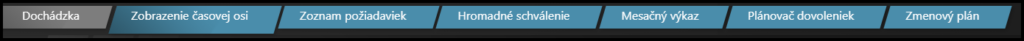 - Tlačidlá – v závislosti od vašich prístupových práv (nová požiadavka v dochádzke, viacnásobná požiadavka na dochádzku, hromadný import požiadaviek atď.).