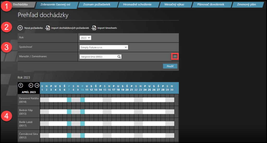 - Určená osoba (napríklad vedúci, manažér…) môže mať povolené čítať, schvaľovať požiadavky, schvaľovať dochádzku. Vie meniť absencie aj prezencie svojich podriadených.