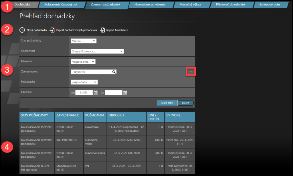 - Požiadavky – zoznam všetkých požiadaviek zamestnancov, ktoré máte povolené zobrazovať.