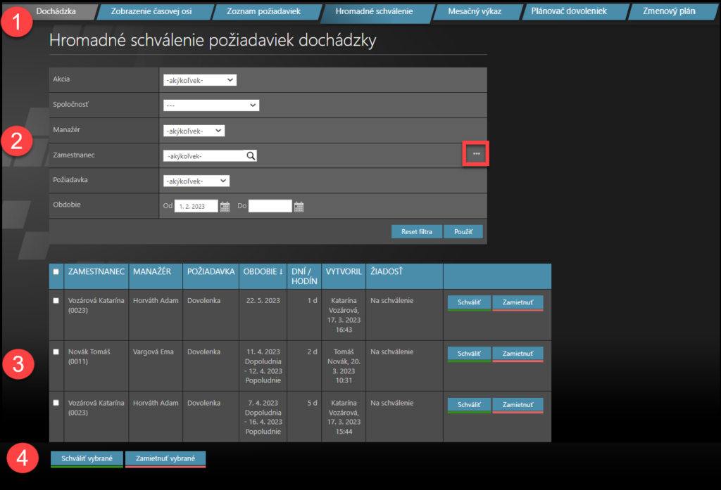 - Hromadné schvaľovanie – môžete vybrať viac zamestnancov a žiadostí naraz (zaškrtnite malé štvorčeky vedľa mien a kliknite na tlačidlá schváliť / zamietnuť v spodnej časti stránky).