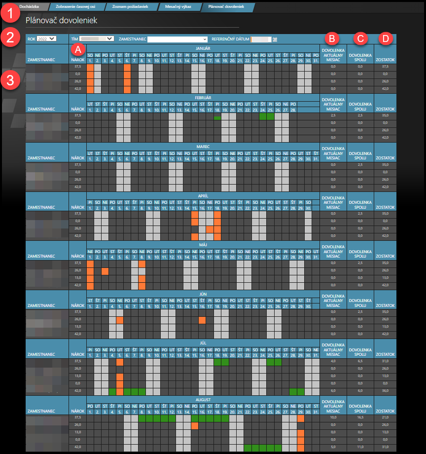 Môžete si naplánovať dovolenku na nadchádzajúci rok a pozrieť si aj plány svojich kolegov na dovolenku. Táto funkcia nevytvára požiadavky v dochádzke a neodosiela ich na schválenie manažérovi, slúži len ako orientačný a plánovací nástroj.
