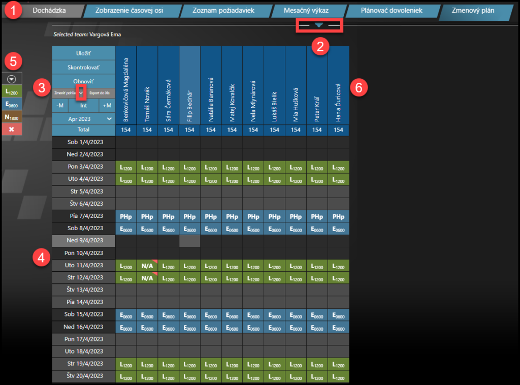 - Filter – kliknutím na tri malé bodky v červenom štvorci zobrazíte ešte viac možností (výber tímov, výber neaktívnych zamestnancov atď.).