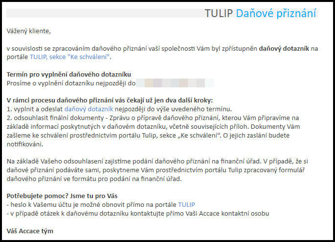Dostali ste ďalšiu e-mailovú notifikáciu (od notifications@tulipize.com) týkajúcu sa daňového dotazníka. Otvorte odkaz v e-maile.