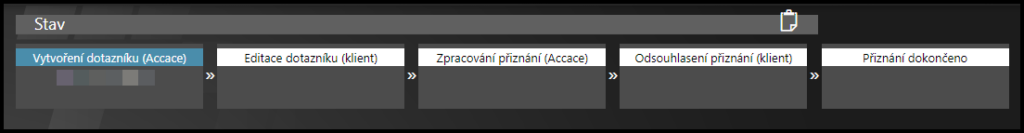 Pozrite sa na panel Stav / Status na vrchu stránky, ktorý zobrazuje aktuálny stav procesu. So spracovateľom dotazníku môžete komunikovať prostredníctvom e-mailu kedykoľvek.