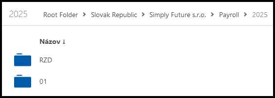 Koreňový priečinok » Krajina klienta » Názov klienta » Payroll (Mzdový priečinok) » Rok » Názov daňového priečinka (napríklad “RZD”)
